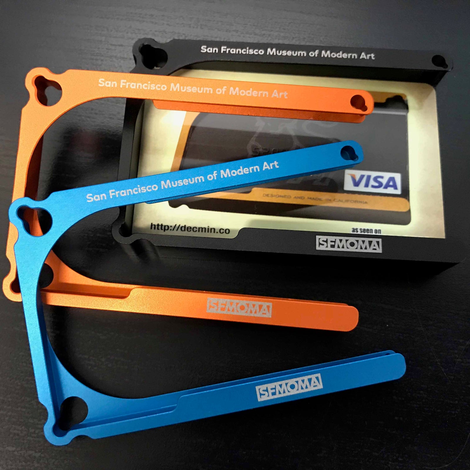 DM1 Wallets are machined from solid billet Aluminum or Titanium. This gives the DM1 the necessary strength an elasticity to protect and securely hold your cards. There are no rubber bands, snaps, velcro, straps or fasteners to wear out or break. Sure - the shape is complex and a little difficult to machine - but it's worth it to produce the simplest to use and most elegant card wallet available.